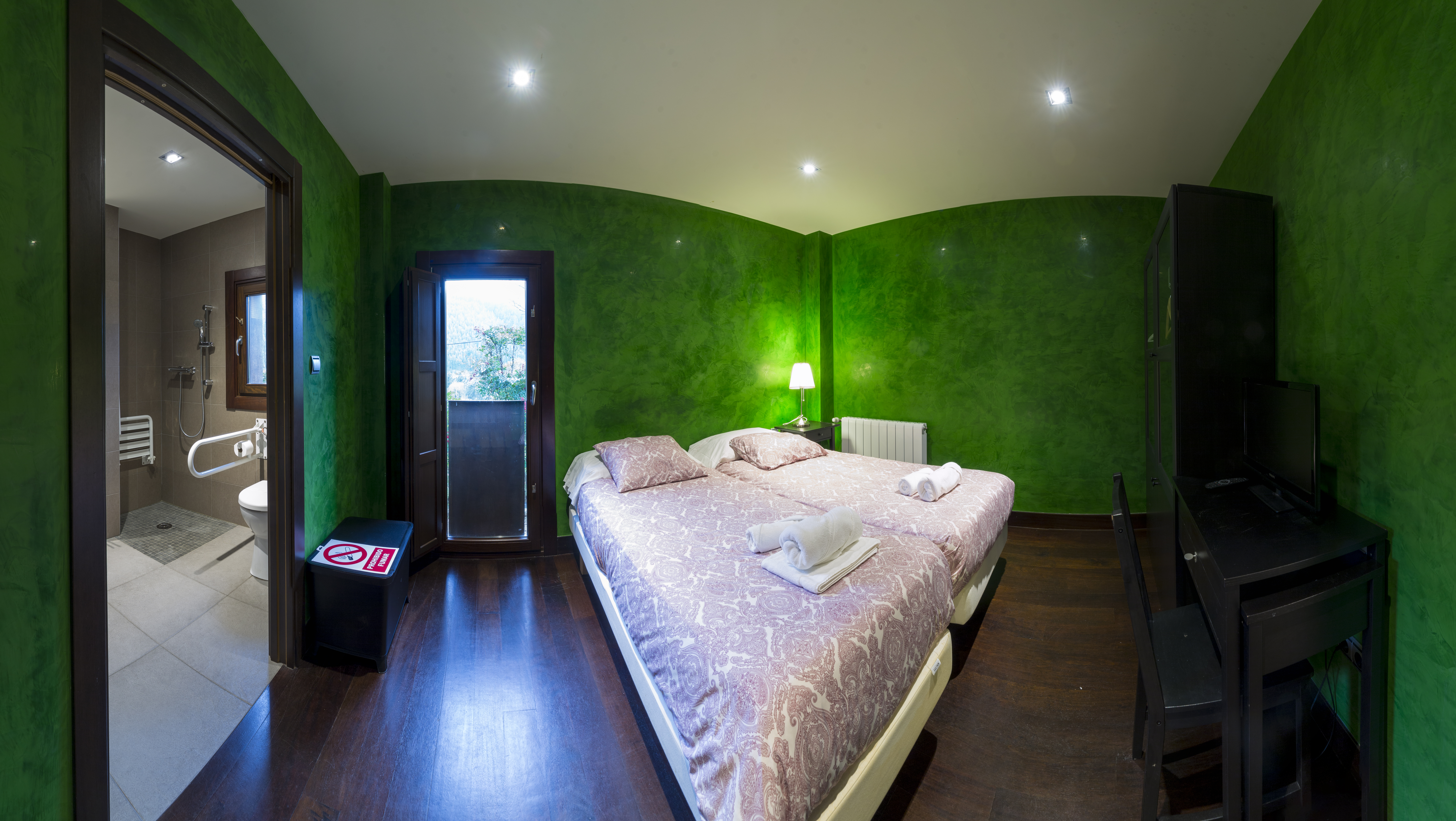 Habitación accesible en la plata baja de Kutxatxuri, decorada en tonos verdes que dispone de baño adaptado para personas con movilidad reducida.